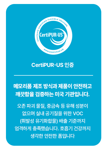100% 미국 기술력으로 Certipur-US 가 인증한 친환경 재료와 공정을 사용합니다.