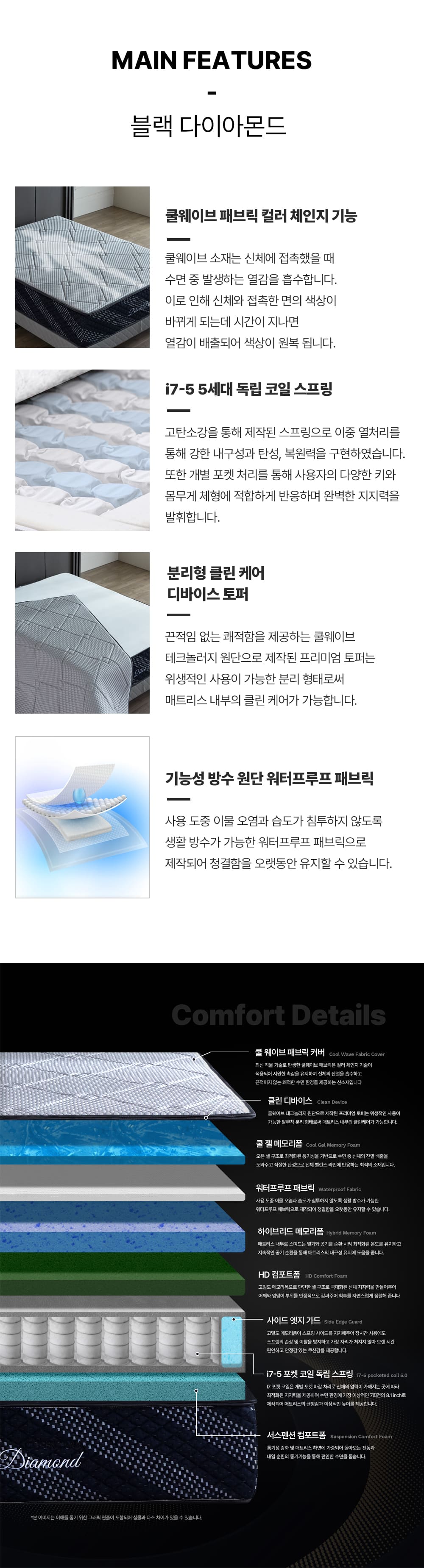 체중분산에 특화된 5세대 포켓 스프링과 분리형 쿨 웨이브 디바이스 토퍼로 인해 위생적인 사용이 가능한 모델입니다.