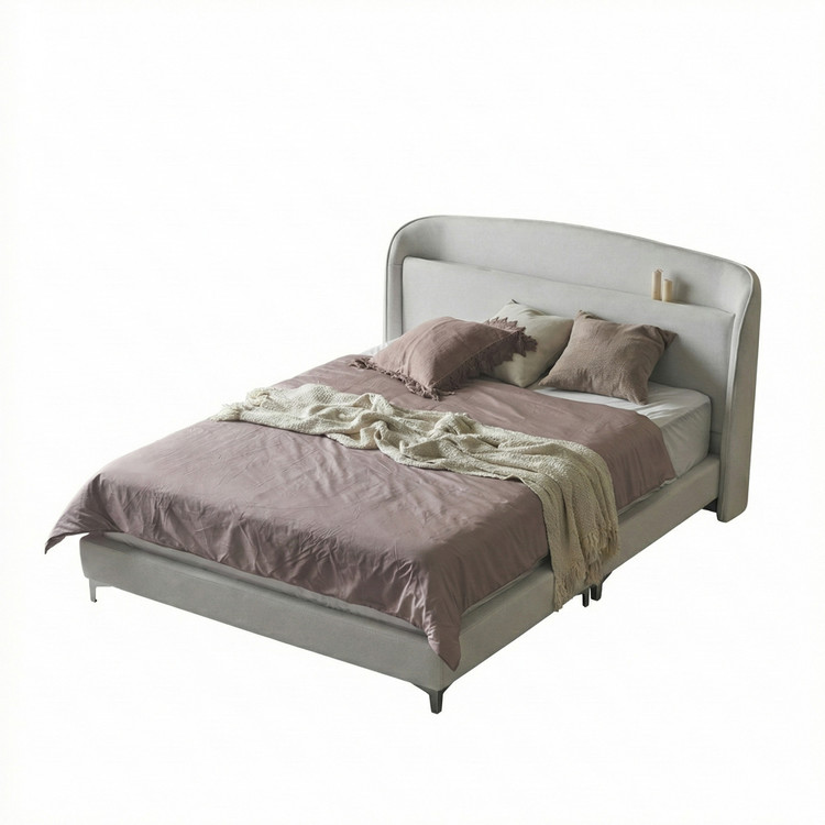 부드럽게 말린 아치형 헤드보드는 공간에 따뜻한 곡선을 더하고,